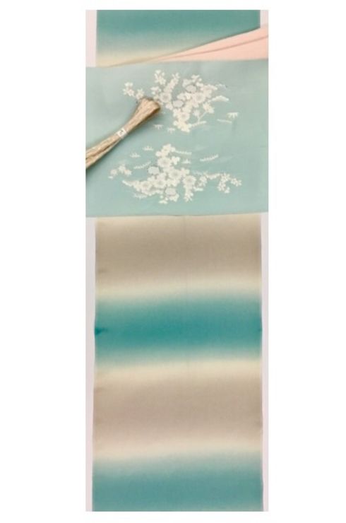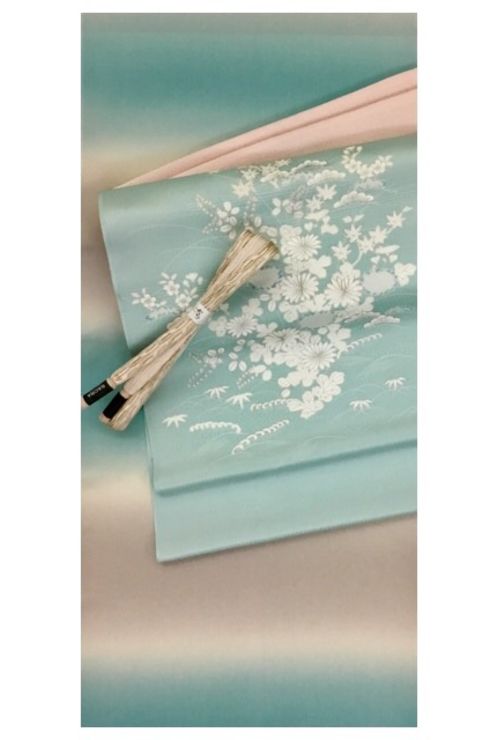 ブルーグリーンとグレーのボカシの小紋に綺麗なブルー地に御所解き模様の染帯を合わせました。
