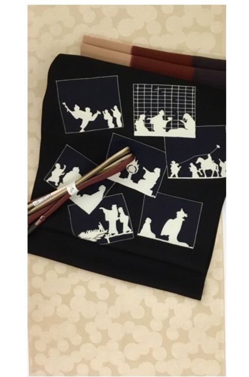 渦巻きの柄の江戸小紋と切り絵の柄の染帯のコーディネイト。
