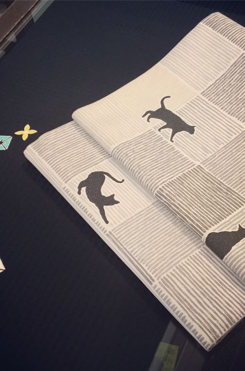 カラフルポップな小紋に猫柄の洒落袋帯をコーディネイト。