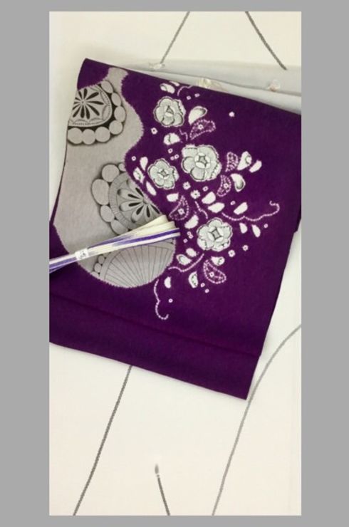 白地に紐の柄にこっくりとした紫地に辻が花とひょうたんが描かれているおもしろい染帯を合わせました。